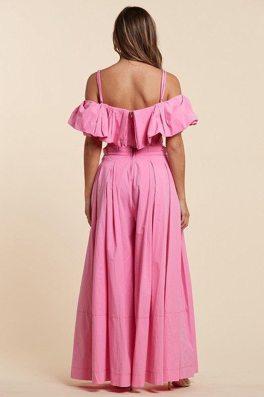 TROPICAL PRINT HALTER TOP WITH FRONT RING AND FLARE PANT SET