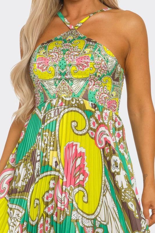 ABSTRACT MULTI PRINT PLEATED MAXI DRESS