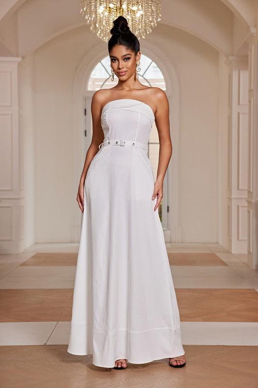 SLEEVELESS BELTED LONG FLARE DENIM JUMPSUIT