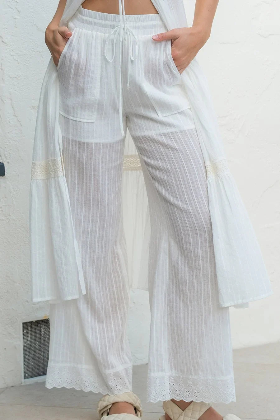 Off White Tie Front Lace Top And Pants Set