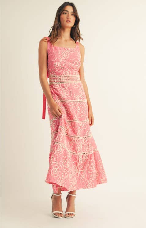 Two-piece Marine set in nautical print consists of a cropped halter top with a sexy keyhole at the chest and lace-up detail in back. The set is complete with a maxi skirt featuring two side slits, an attached self-tie belt, and bright pops of solid color at the hem.